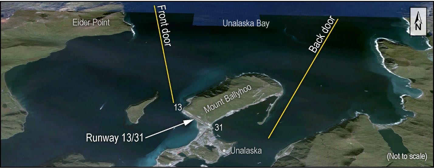 The Unalaska runway showing the “front door” and “back door” runway visual approaches. [Reproduced from the Official Report]