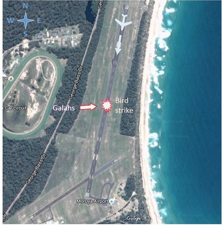 The runway at Moruya showing the direction of movement of the flock of Galahs. [Reproduced from the Official Report]