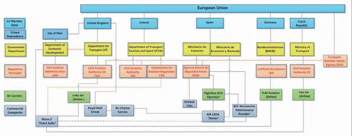 The event was Investigated by the Irish AAIU with the aid of some technical assistance provided by the UK Aircraft Accident Investigation Branch (UK) (AAIB). The Investigation established that the aircraft involved had been leased to another company which was not the holder of an Air Operator Certificate but termed by the Investigation as the ‘Owner’, who in turn sub-leased it to a small Spanish AOC holder called Flightline S.L. - the ‘Operator’ - which sold the provision of “passenger air transport service” to a ‘Ticket Seller’ based on the Isle of Man called “Manx2” which was not the holder of Air Operators Certificate. The aircraft was maintained by another (Spanish) Company termed by the Investigation the ‘Maintenance Provider’ which neither directly provided nor contracted line maintenance provision in respect of the remote operation being carried out from a base in the Isle of Man, a non-EU Territory.