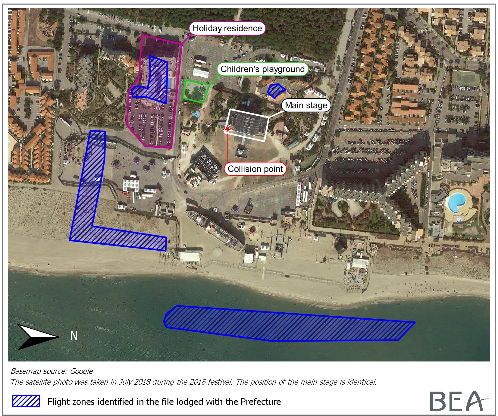The approved flight zones, the festival stage and the location of the collision. [Reproduced from the Official Report]