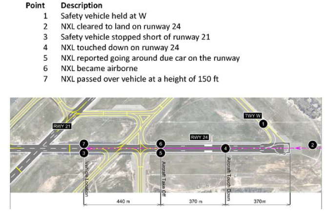 As the 717 touched down on runway 24 approximately 370 metres from the threshold, the First Officer saw the flashing lights of a vehicle ahead on the runway, immediately called "go rround, car on the runway" and the Captain commenced a go-around. The aircraft became airborne again after about 6 seconds and a ground roll of about 370 metres. At this time, the safety vehicle was still stopped on the centreline of runway 24 about 1180 metres from the threshold and facing away from the approaching aircraft. The vehicle driver did not see the aircraft until it had passed about 150 feet over his vehicle and promptly queried what had happened. Shortly afterwards, the TWR controller was relieved. The sequence of events is shown on the annotated runway diagram below: