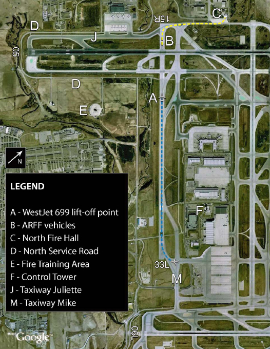An Investigation was carried out by the Canadian TSB. It was established that when the three vehicles, which were Rescue and Fire Fighting Services appliances en route to the fire training area, entered the upwind end of runway 33L on which the 737 was taking off, (see the diagram below), the aircraft was approximately one third of the way along the 9,088ft. (2,770m.) long runway. It was found that just over half a minute before the North TWR controller had cleared the 737 to take off on runway 33L, the GND north controller had, believing that runway 15R/33L was under his control, cleared the three emergency services vehicles to enter Runway 15R.