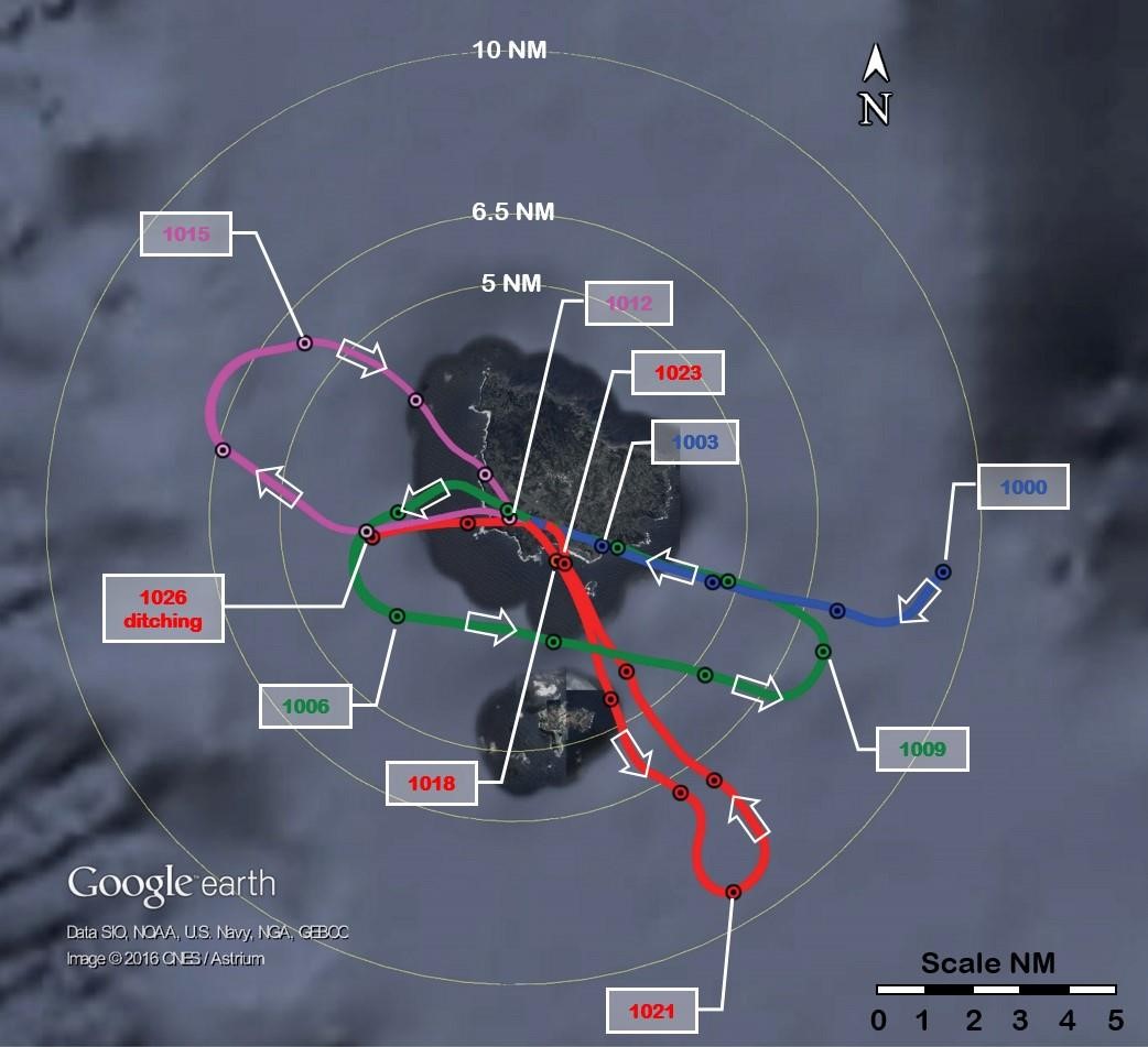 The aircraft ground track on arrival at Norfolk Island showing the first approach (blue), second approach (green), third approach (purple) and fourth approach and ditching (red). [Reproduced from the Official Report]