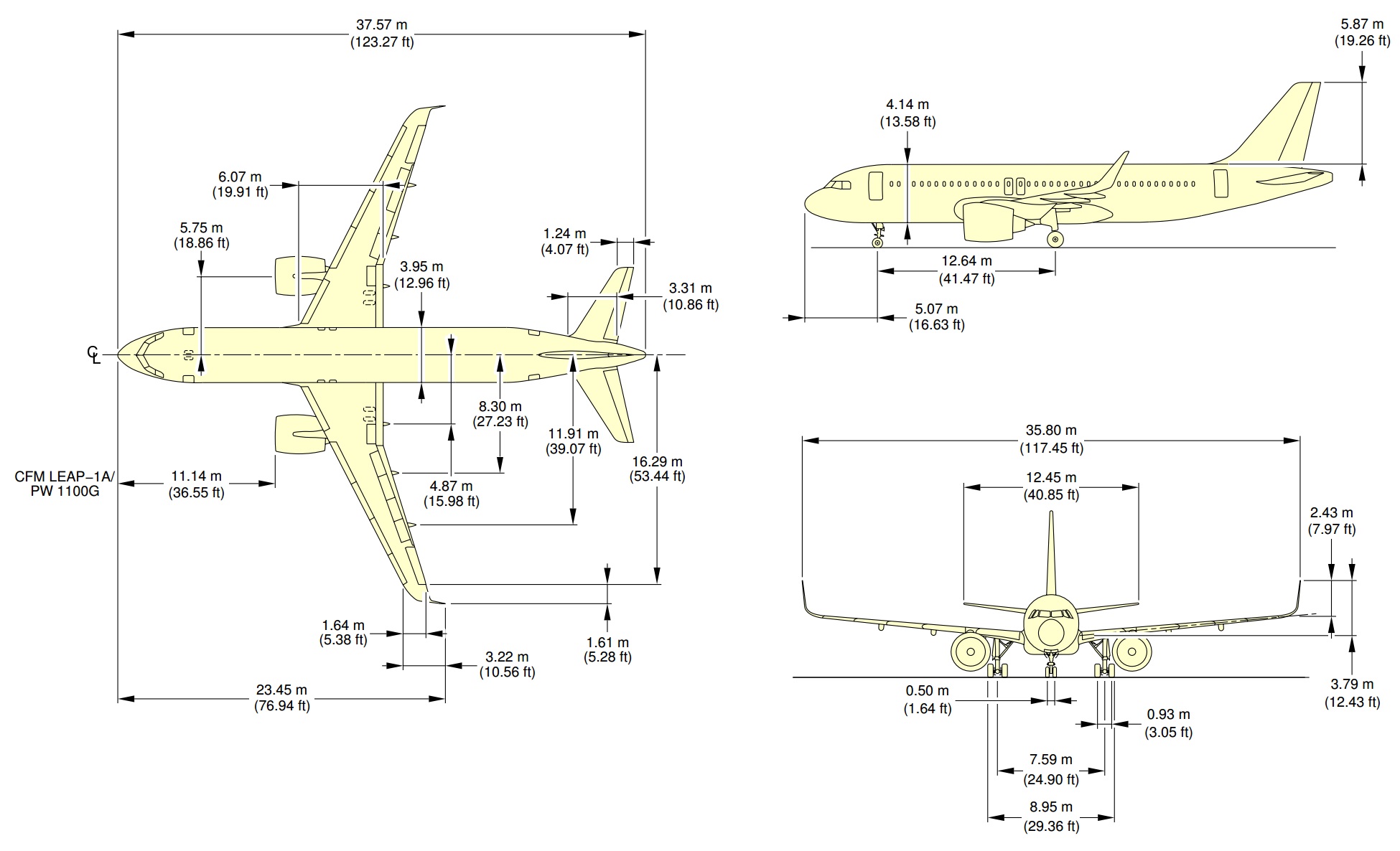 - Airbus reference document which provide to airlines, MROs, airport planners and operators the general dimensions of the aircraft, as well as the necessary information for ramp, servicing operations or maintenance preparation: Airbus A320: Airplane characteristics for airport planning AC, 01 May 2017