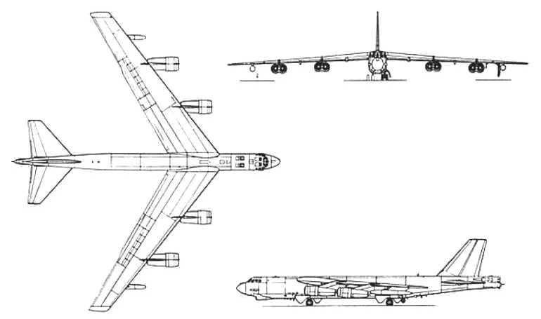 Strategic long range bomber. In service since 1955. Replacement for strategic air commands B-50. Development of the B-29 Superfortress. A number of 744 aircraft were built. Last Turbofan powered version B-52H is to remain in service past 2000. Re-engined 4 CFM engines version of B-52H for US Air Force proposed by BOEING. Max Mach 0.86
