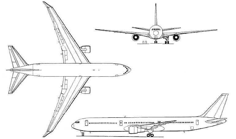 The Boeing 767 is a mid-size, wide-body twinjet airliner produced by Boeing Commercial Airplanes. Passenger versions of the 767 can carry between 181 and 375 passengers, and have a range of 5200 nm to 6590 nm depending on variant and seating configuration. The Boeing 767 has been produced in three fuselage lengths: