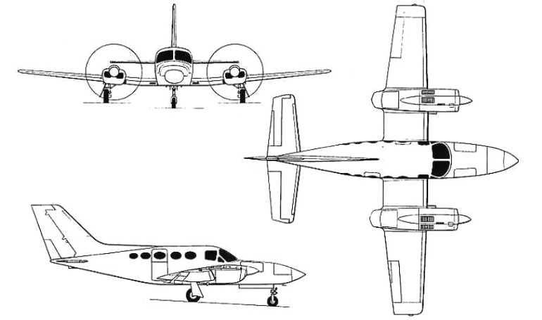 Utility twin engine aircraft. In service since 1967. Pressurized development of CESSNA 411. Improved version CESSNA 421B Golden Eagle with lengthened nose and wing span. Last version (from 1975) CESSNA 421C with bonded wet wing, no tip tanks and higher vertical tail. Production ceased in 1985.