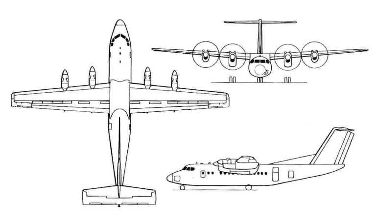 4 x 1.120 SHP P&W PT6A-50 turboprops with 4 blade propellers.