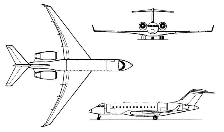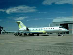 Ultra long range, high speed corporate jet. In service since 1999. The development of an ultra long range corporate version of the Bombardier (CANADAIR) Regional Jet airliner, with the same fuselage cross section, new wings, new swept T-tail and six screen Electronic Flight Instrument System cockpit.