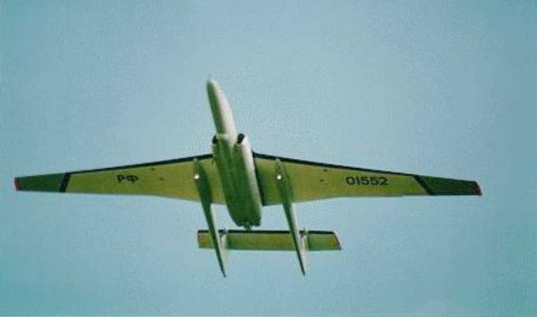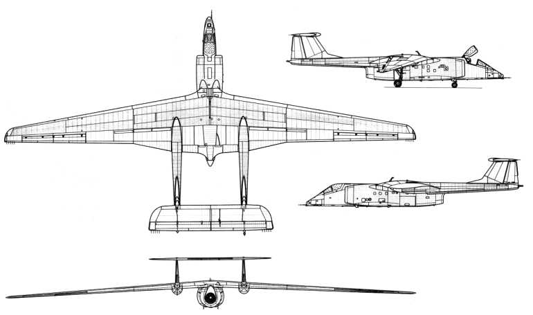 The design of the Chaika was adapted as a reconnaissance aircraft and emerged as the Myasishchev M-17 Stratosphera with a revised airframe, including straight tapered wings with 2° 30' anhedral (0° at 1g), shorter fuselage pod and unreheated Kolesov RD-36-51 turbojet engine.
