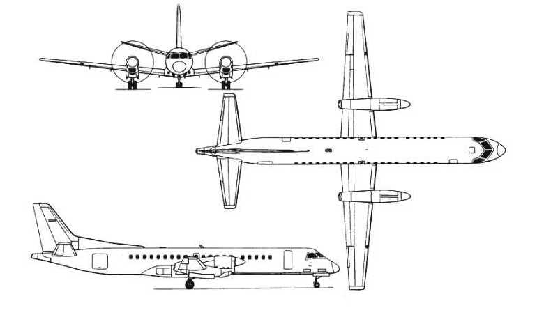 Turboprop regional airliner. In service since 1994. Stretched, more powerful development of SAAB 340 regional airliner. First civil aircraft powered by Allison AE-2100A turboprops (developed for the V-22 Osprey tiltrotor). Cabin noise is reduced by an active noise control system with 72 microphones and 36 speakers which generate an anti-phase noise. 56 aircraft were built until 1998 and production then ceased.
