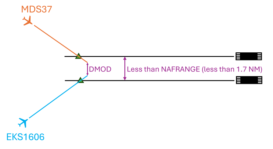 - The encounter is not discarded as the distance between the aircraft does not increase above NAFRANGE. This could happen when the final approach tracks are closely spaced and the aircraft are not staggered enough (i.e. one is not enough ahead of the other).