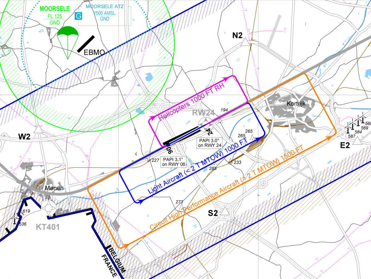 An example of an aerodrome traffic circuit (EBKT, RWY 24) defined in the AIP. Three circuits are defined for different aircraft types (helicopters, light aircraft and others).