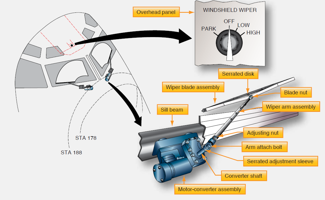Windshield wipers are the most common rain protection feature. Most of them use electrical motors but some aircraft may be equipped with hydraulic wiper motors. Usually the pilot’s and copilot’s windshield wipers are operated by separate systems to ensure that clear vision is maintained through one of the windows should one system fail. Each windshield wiper assembly consists of a wiper, wiper arm, and a wiper motor/converter. In many cases, windshield wiper systems will have limiting airspeed, above which they must not be operated. This limitation is due to the increased slipstream loading on, and the potential of damage to, the wiper assembly at higher speeds.