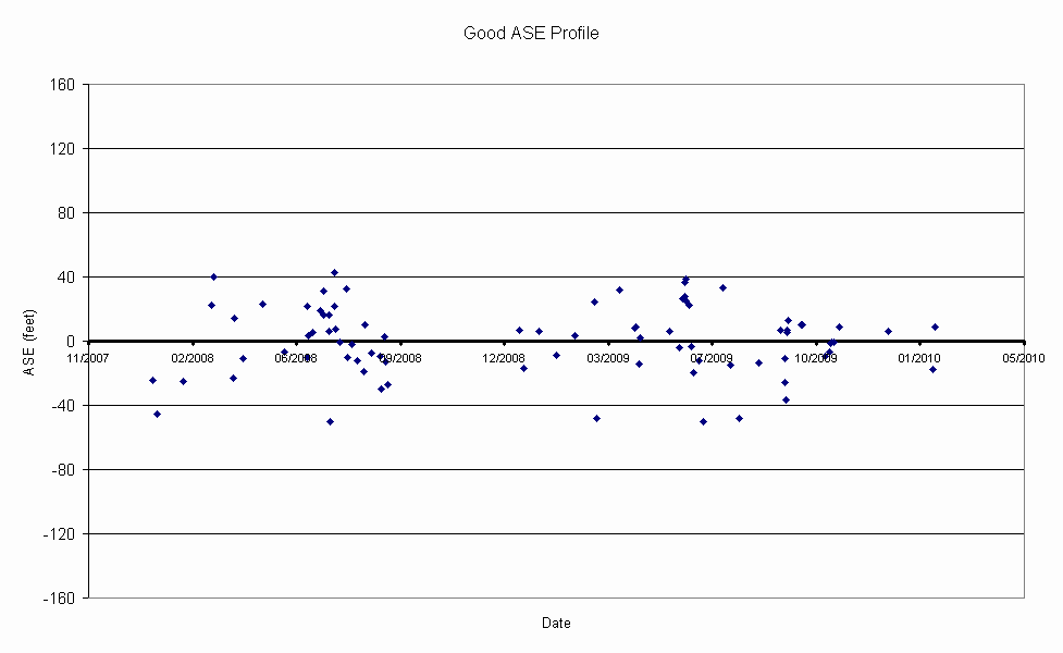 The graph below illustrates an aircraft ASE profile that has a low ASE and is also stable over time. The zero value on the vertical axis represents a zero value of ASE so that the position of the individual results above or below this value (as indicated by the graph plots) represents the magnitude of ASE for this aircraft (between +40 and -50 feet)