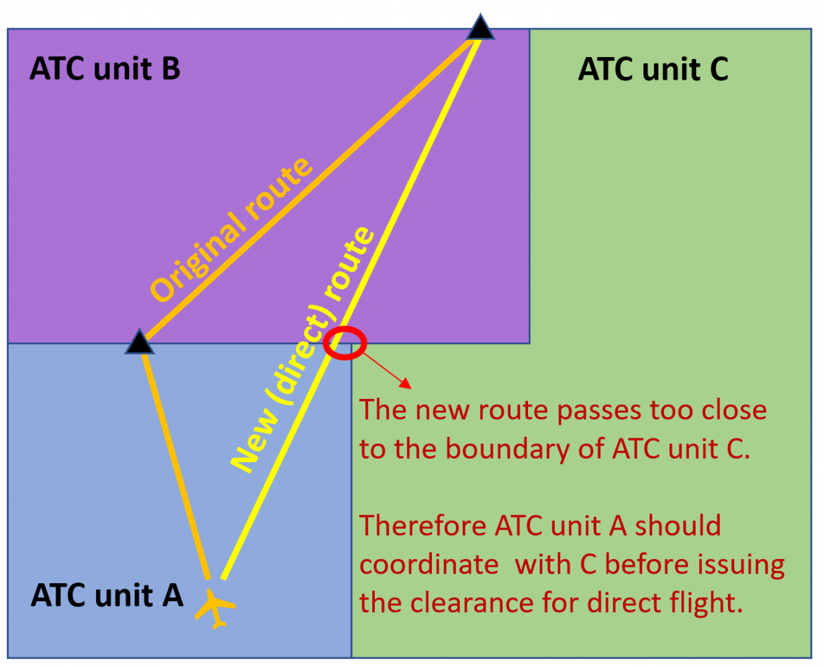 - Identification of situations that are subject to coordination is critical. Most of these are described in local procedures but some are considered as "similar" and are not explicitly stated. For example (see picture below), a coordination with ATC unit B for a direct route may place the flight in close proximity to ATC unit C. In this case, it is up to the controller from ATC unit A to coordinate with ATC unit C.
