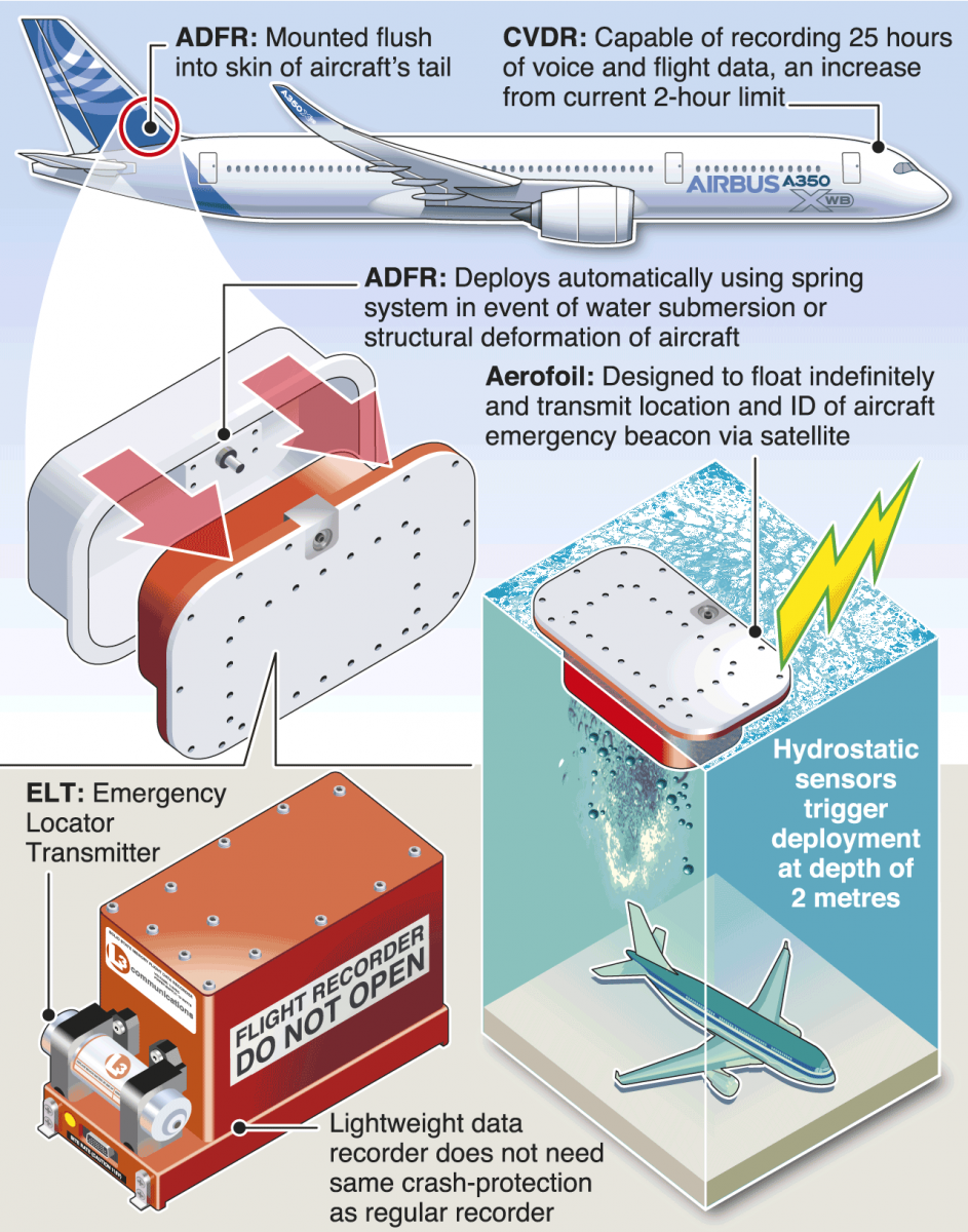 Obtaining flight data recorder (FDR) and cockpit voice recorder (CVR) content as quickly as possible after an aircraft accident is crucial in determining the causes and contributing factors, and, more importantly, in developing safety recommendations to prevent similar accidents. Some historic accidents and more recent events — such as the disappearance of Malaysia Airlines Flight 370 in 2014 and the crash into the Atlantic Ocean of Air France Flight 447 in 2009 — have shown that in some accident scenarios, timely recovery of these flight recorders proved to be impossible. When an accident occurs in a remote area, over water or at an unknown location, recovering the flight recorders can be a significant challenge. Therefore, the development of deployable flight recording systems (DFRS) for commercial aircraft has begun.