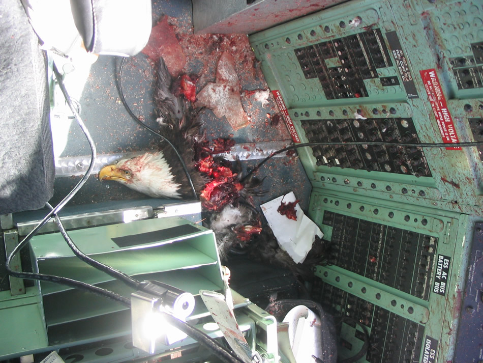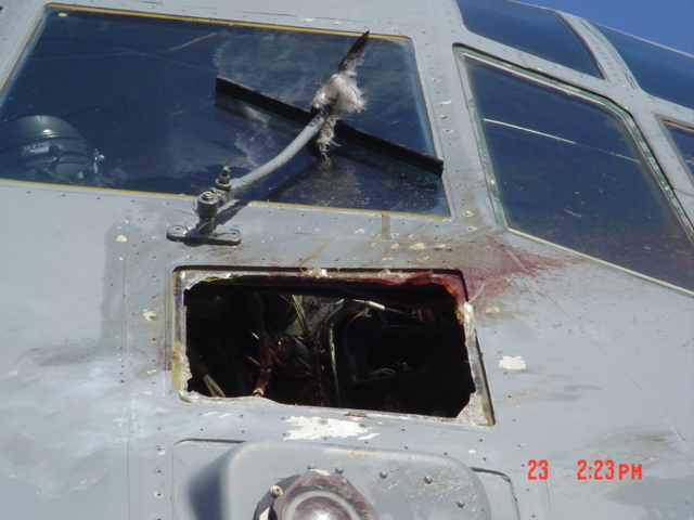 It is generally recognised that most military aircraft operations have a much bigger problem with damaging bird strikes than is experienced with civil transport aircraft operations. This is usually attributed to a greater proportion of flight conducted at low levels. The graphic images below show what happened when a C130 Hercules hit a Bald Eagle near Tacoma WA USA. Luckily, the bird entered the flight deck through a lower window, close to the pilot's left leg. The pilot was uninjured but you can see that his legs are covered in remains. This is a not uncommon event for low flying military aircraft and one of the main reasons why helmets with visors are worn by fast jet pilots: