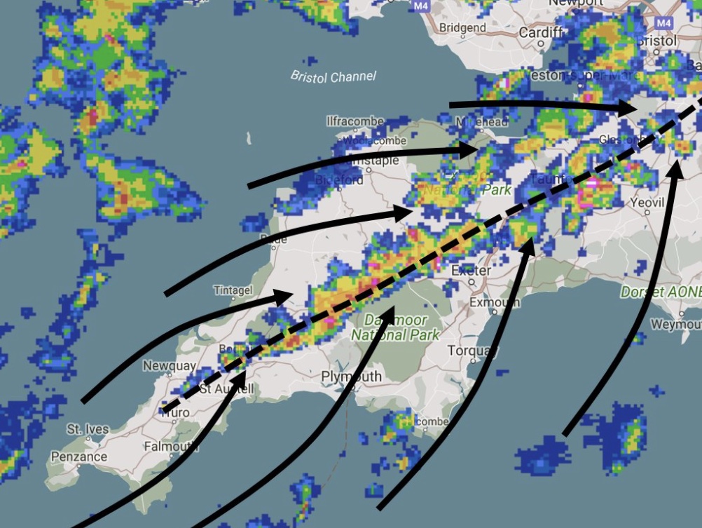 In the summer, the land heats up more then the sea causing sea breezes to establish during the day. Converging sea breeze fronts from the north and south coasts of Cornwall can lead to rapid convection developing over the moor, which may result in very heavy showers or thunderstorms.