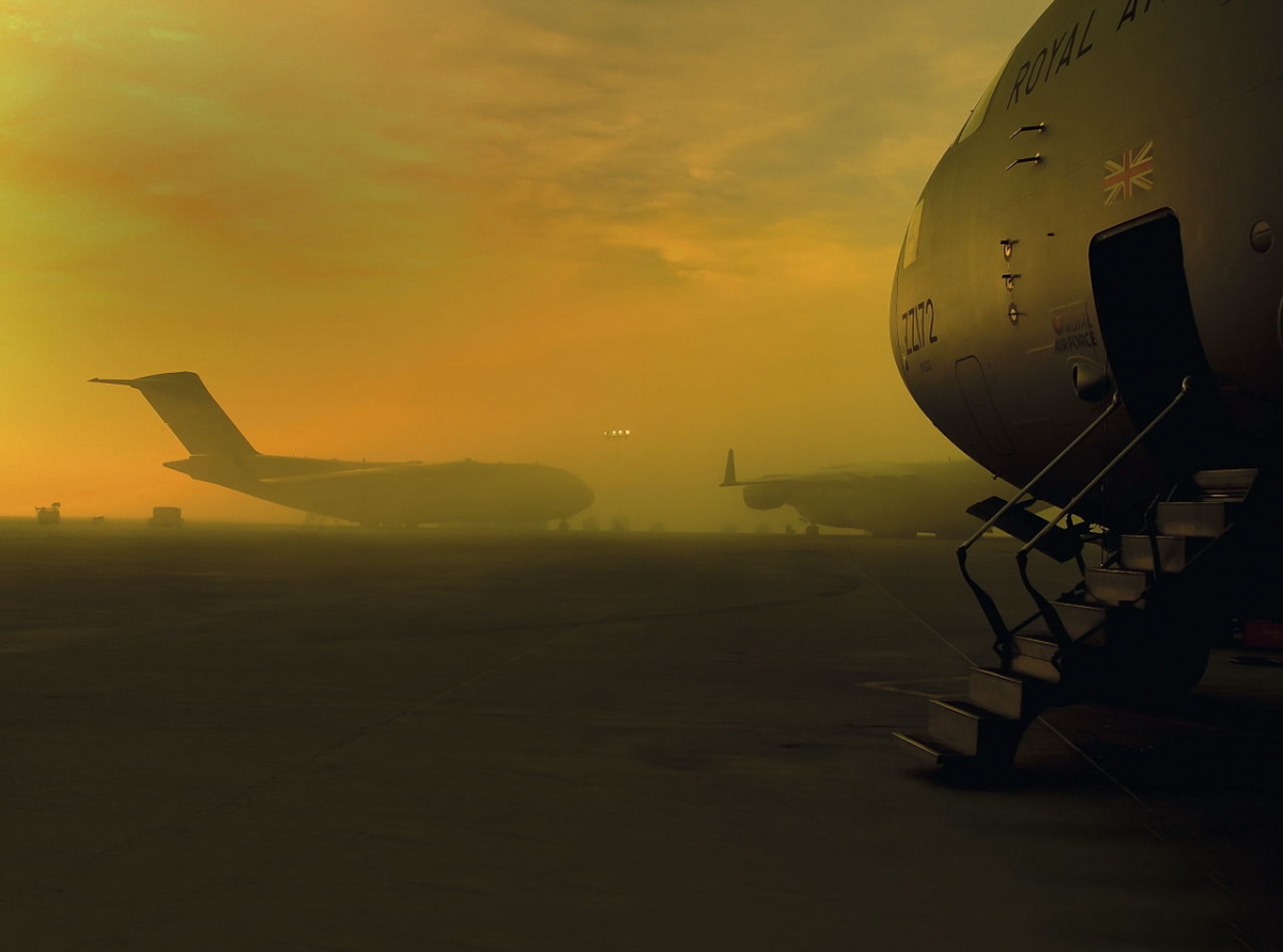 Royal Air Force C17 Globemaster transport aircraft are pictured in the early morning mist at RAF Brize Norton in Oxfordshire, UK, 7 Dec 2007. Source: Wikicommons. Author: Flt Lt Chris Knight