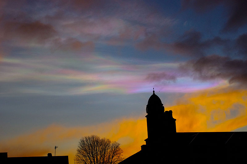Cloud iridescence is the occurrence of colors in a cloud similar to those seen in oil films on puddles, located in the general vicinity of the sun or moon. It is a fairly common phenomenon, most often observed in altocumulus, cirrocumulus, lenticular clouds and cirrus clouds. The colors are usually pastel, but can be very vivid. When occurring near the sun, the effect can be difficult to spot as it is drowned in the sun's glare. This may be overcome by blocking the sun with one's hand or hiding it behind a tree or building. Other aids are dark glasses, or observing the sky reflected in a convex mirror or in a pool of water.
