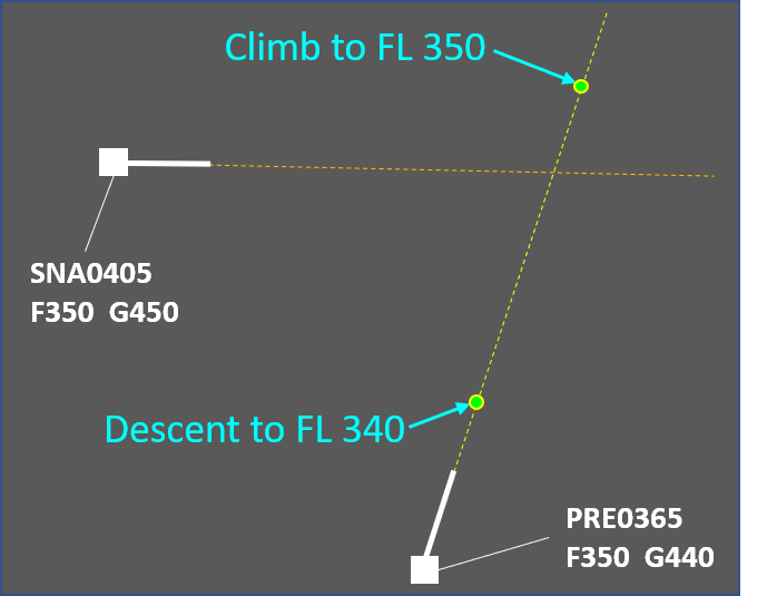 - Level change. This solution is typically used for conflicting aircraft in level flight. In the crossing case, an opposite level may be used for a short time and then the aircraft will climb again to its cruising level. This is not an option in the converging scenario, meaning that the level change needs to be at least 2000 feet. Sometimes it is possible to use opposite levels for converging conflicts but this requires coordination with the downsteam sector or unit.