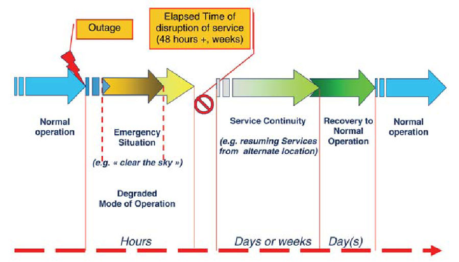 The horizontal axis shows the time. The durations of the different phases shown are not representative of the length of those phases. They could be very different from one event to another or from one environment to another. This Lifecycle should not necessarily be understood as a sequence of modes of operation. For instance, in certain circumstances depending on the cause/type of disruption: