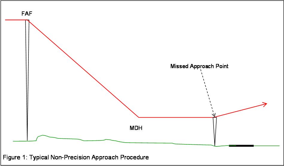 Controlled flight into terrain (CFIT) is a primary cause of worldwide commercial aviation fatal accidents. Unstabilized approaches are a key contributor to CFIT events. If the NPA is flown in the traditional fashion, step down fixes will require multiple thrust, pitch, and altitude adjustments inside the final approach fix (FAF). These adjustments increase both the pilot workload and the potential for error during a critical phase of flight. NPAs designed without step down fixes in the final segment allow pilots to immediately descend to the MDA after crossing the FAF. In both cases however, the aircraft must remain at the MDA until commencing final descent for the runway or reaching the missed approach point (MAP). This practice can result in extended level flight at altitudes as low as 250 feet above the ground in instrument meteorological conditions (IMC) and shallow or steep final approaches once the runway is in sight. The overall result is that a traditionally flown NPA makes it very difficult to achieve a stabilised approach and smooth transition to visual flight. Additionally, landing attempted at or near the missed approach point due to late runway acquisition could be extremely dangerous due to the excessively steep approach angle.