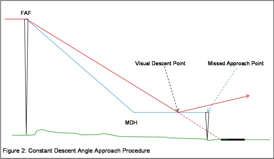 Figure 2 illustrates the Continuous Descent Final Approach (CDFA) concept. The path of the aircraft is again coloured red and the standard non-precision approach path is coloured blue for comparison purposes. The aircraft crosses the FAF at, or above, the published crossing altitude and then descends at a constant rate, or constant angle (dependent upon aircraft equipment) which, if continued below the MDH, would result in it crossing the runway threshold in a position to land the aircraft. A simple calculation, based on distance, height to lose and ground speed, is necessary to determine the rate of descent required. With aircraft capable of maintaining a desired Flight Path Angle (FPA) or using GNSS navigation capability, the CDFA is refined further such that the resulting constant angle approach path will cross the MDH at the Visual Descent Point (VDP). In virtually all cases, the CDFA procedures consider the MDH as a decision altitude (DA) and, if the runway is not in sight when the aircraft reaches the MDH, a go-around must be flown. Note that some regulators require that a buffer be added to the MDH when using it as a DA for a CDFA so that descent below the published MDH does not occur during initiation of the go-around procedure.