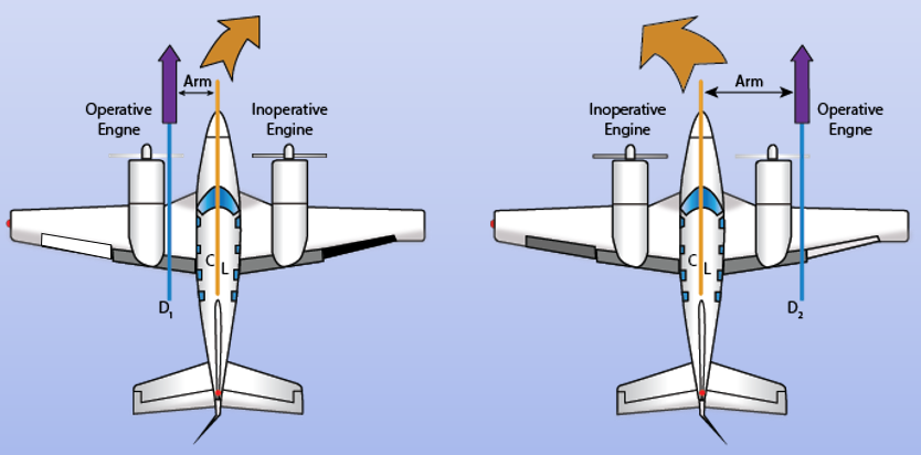 When one engine becomes inoperative, a torque develops which depends on the lateral distance from the center of gravity (C.G.) to the thrust vector of the operating engine, multiplied by the thrust of the operating engine. The torque effect attempts to yaw the aircraft's nose towards the inoperative engine, a yaw tendency which must be counteracted by the pilot's use of the flight controls.