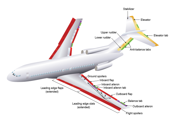 B727 Flight Control Surfaces. Source: Wikicommons. Origin: FAA(USA)