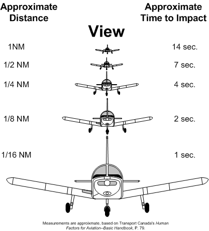 The hazard of mid air collision contributed by empty field myopia is compounded by the fact that the frontal area of the aircraft profile is small and an aircraft viewed directly from the front, especially flying a head-on collision course, shows little relative movement. This makes detecting the other aircraft by the pilot very difficult.
