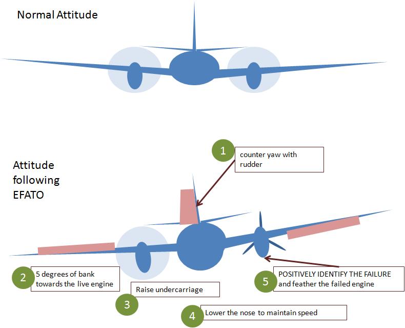 "In the event of an engine failure immediately after takeoff, I will counter the yaw with rudder and use aileron to raise the dead engine. I will raise the undercarriage and lower the nose to maintain airspeed. I will then positively identify the failure and feather the failed engine..."