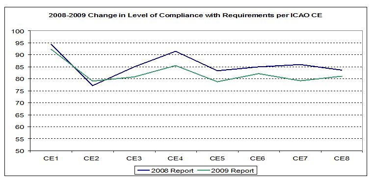 When considering the sample of 21 ESIMS audits for which the Final Audit Reports were released in 2009, the aggregated scores obtained against the ICAO model are as follows: