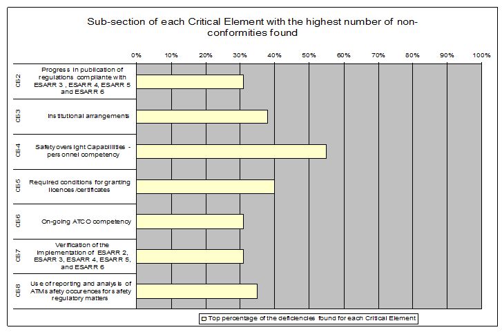 - CE3 (State Aviation System and Safety Oversight Functions) - The results show that around 38% of all the non-compliances discovered in CE-3 concerned the institutional arrangements for safety oversight. A number of Member States audited had problems with identifying and establishing appropriate arrangements as regards the responsibilities, interfaces and coordination necessary for the implementation of ESARRs, with ESARR 2, ESARR 4 and the ESARR 5 provisions for engineering/technical personnel being the most problematic. Moreover, 20% of the deficiencies found, relate to institutional arrangements, and specifically safety oversight exercised by the NSA as part of the supervision of regulatory requirements applicable to the provision of ATM services to general air traffic.