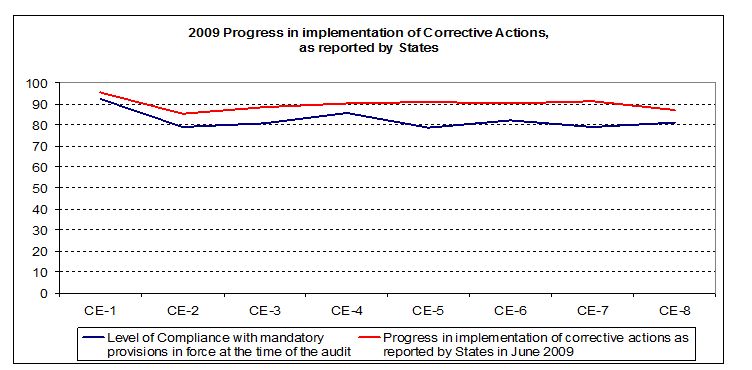 The following graph is based on the reports received from 18 States previously audited under ESIMS, and shows the progress made in the implementation of corrective actions.