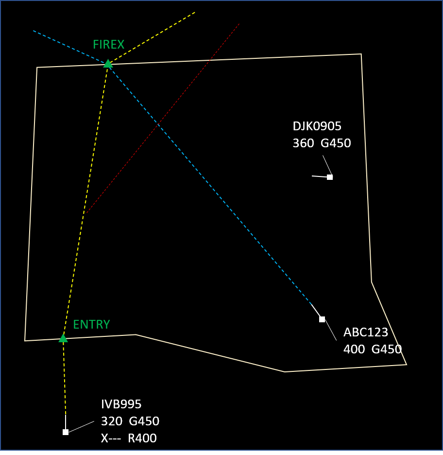 Then, the PLN checks whether FL 400 is achievable at the exit point. PLN notices that ABC123 is already maintaining FL400 and is also exiting via FIREX. Therefore, PLN sets the exit flight level of IVB995 to FL 380. However, PLN also notices that there is a crossing conflict with DJK0905 at FL 360. Therefore, PLN advises EXE to initially clear IVB995 to FL 340.