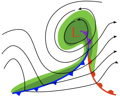 A competing theory for extratropical cyclone development over the oceans, the Shapiro-Keyser model, was developed in 1990 and based on data from surface observations and aircraft to determine vertical structure of fronts in the northwest Atlantic. Its main differences with the Norwegian Cyclone Model are the fracture of the cold front, treating warm-type occlusions and warm fronts as the same, and allowing the cold front to progress through the warm sector perpendicular to the warm front. With this model, a weakness appears along the poleward portion of the cold front near the low centre (frontal fracture) and a back-bent front forms behind the low centre. The back-bent front can also be associated with the sting jet phenomenon - a short duration flow of strong winds that can reach 100 kts at surface level.