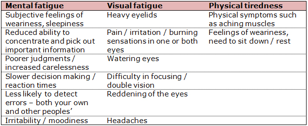 Controllers and engineers may experience only some of the signs shown in the table below and may not necessarily associate them with fatigue.
