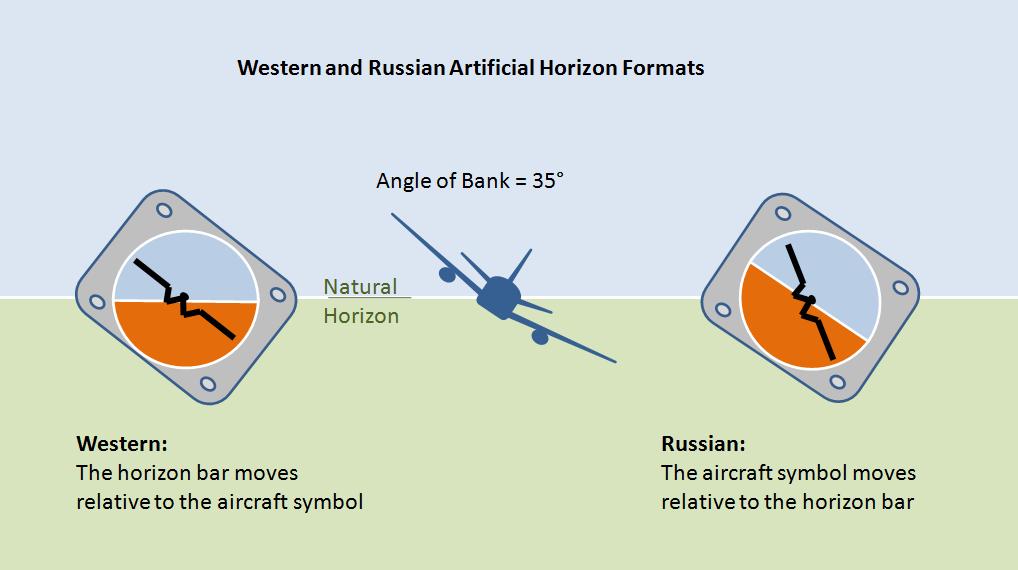 Certain investigations of commercial air transport accidents have pointed to negative transfer with pilots who were initially trained on the Russian-type horizon displays and then transitioned to the "western-type" display. The significance of the display transition is that if a pilot suddenly becomes aware of an abnormal roll attitude for which the recovery needs to be intuitive rather than "considered," then any attempt to ‘fly’ the horizon line on a banked western-built aircraft back onto the (fixed) aircraft symbol will actually increase rather than reduce the bank angle.