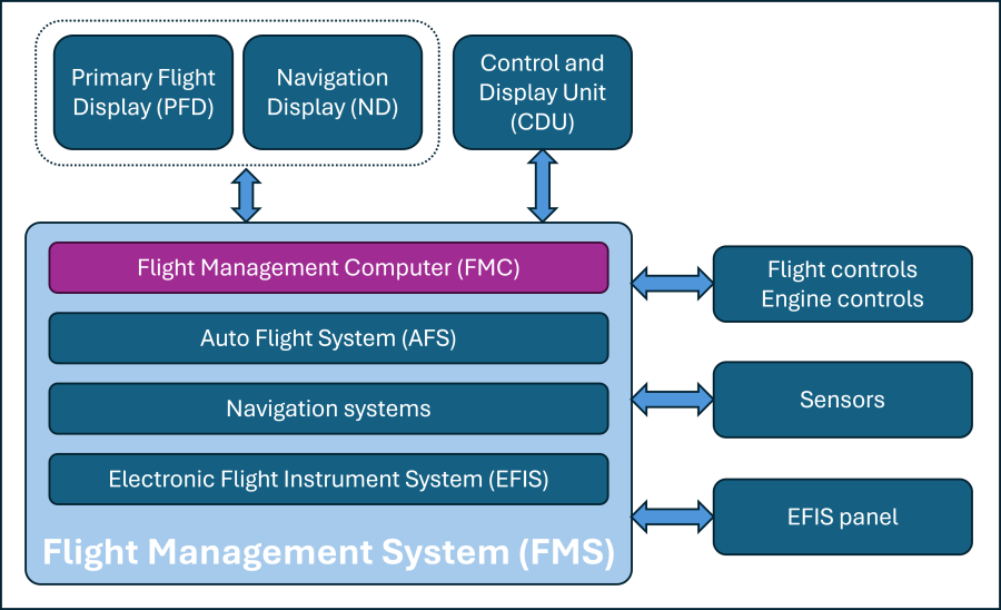 - Auto flight control. The FMC is linked to the autopilot, enabling automated control of the aircraft's altitude, heading, and speed according to the flight plan.