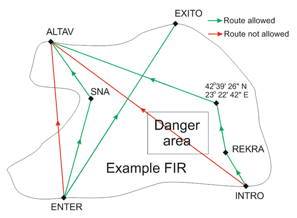 In the example FIR depicted, INTRO and ENTER are entry points, ALTAV and EXITO are exit points, SNA is a VOR and REKRA is an RNAV point. When FRA is implemented, the green routes would be accepted and the red routes would be rejected by the ATC flight plan processing system.. The reasons for rejection include the crossing of a danger area (INTRO-ALTAV) and the requested route not remaining within the FRA (ENTER-ALTAV). The approved routes can be either direct from an entry to an exit point (e.g. ENTER-EXITO) or with intermediate points (navigational aids (SNA), published points (REKRA) or randomly selected points (42°39’26” N, 23°22’42” E)).