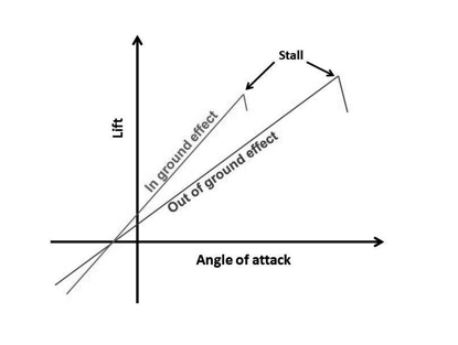 A generic portrayal of the difference in stalling angle of attack in and out of ground effect is provided below. Since bringing a wing into ground effect increases lift, it follows that a given angle of attack will reach maximum lift at a lower angle of attack than it would in free air - but also that maximum lift will be less than in free air because of the reduced drag.