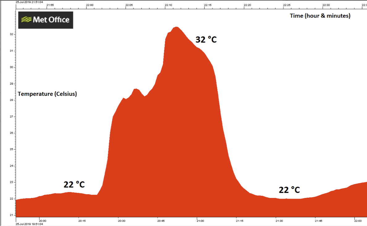 Temperature curve recorded at Donna Nook, Lincolnshire, UK on evening of 25 July 2019, associated with collapsing thunderstorm, showing 10C spike in surface temperature - source: UK Met Office