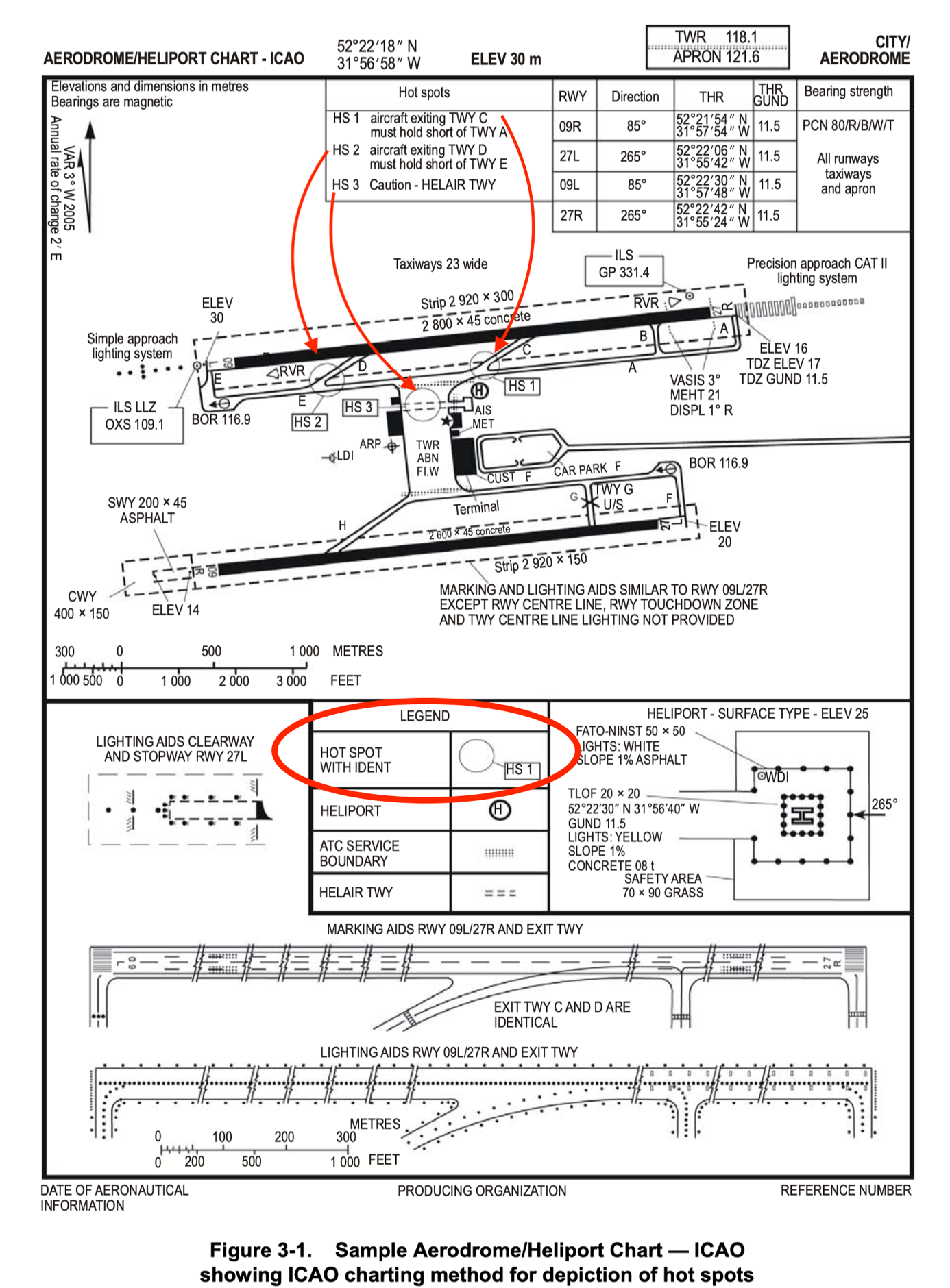 Two ICAO examples of runway hotspot charts and information are shown below.