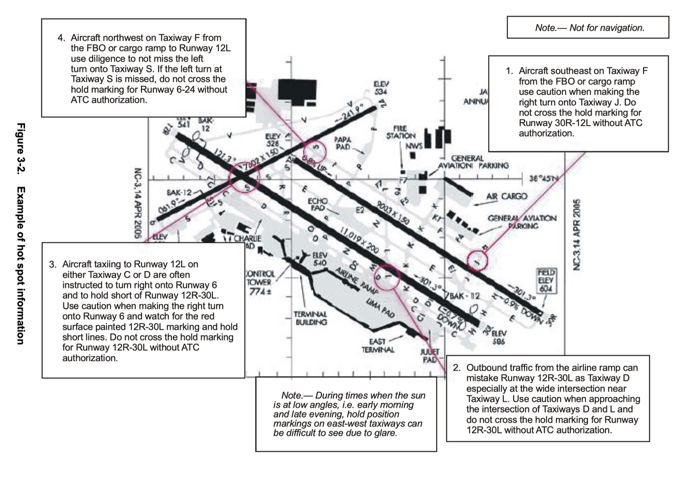 - Where the aerodrome diagram would otherwise be too cluttered to present Hot Spots effectively, the use of specific Hot Spot pages can be effective.