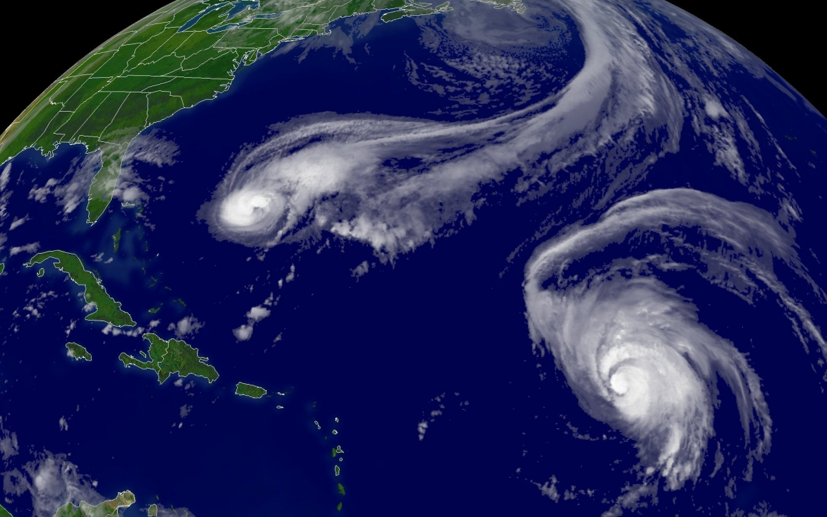 Hurricane Jeanne in the Atlantic east of the Bahamas. Maximum sustained winds are near 90 mph. Hurricane Karl is to the east with winds near 140 mph. Source: NOAA