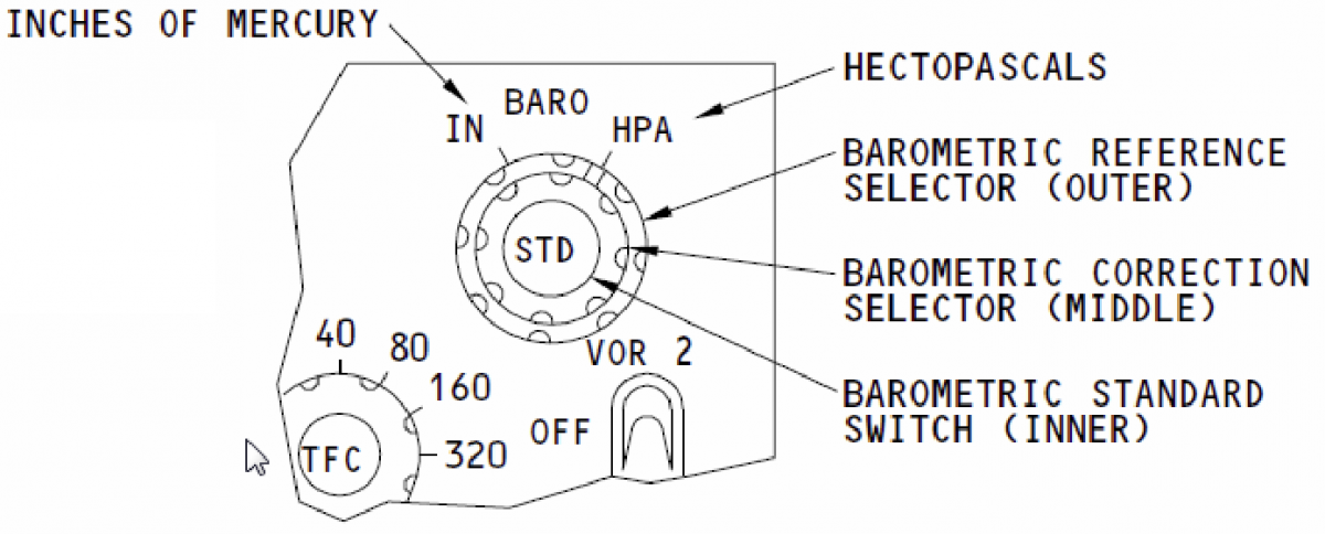 Electronic Flight Instrument System Control Panel example of a complex (outer, middle, inner 3 concentric positions) Barometric knob