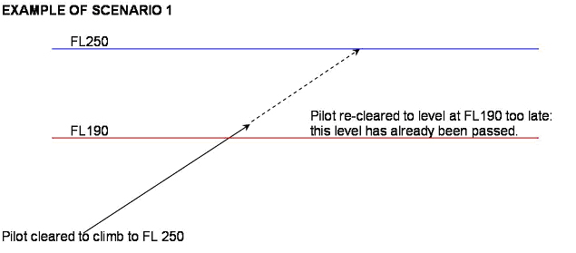 • Scenario 1. The ATCO issues a clearance to climb or descend to a specified flight level and the pilot follows this clearance. Subsequently, the ATCO instructs the pilot to level at an intermediate flight level but at the time of this re-clearance the flight has passed the re-cleared flight level.