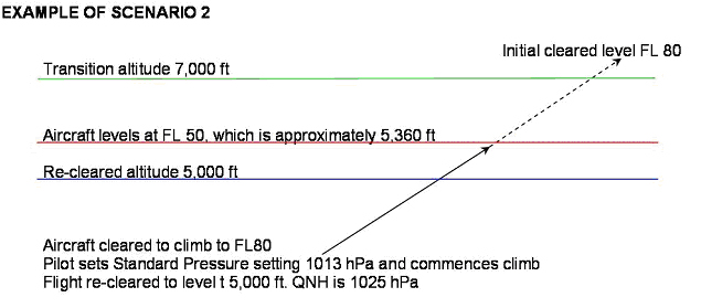• Scenario 2. The flight is cleared to climb from below the transition altitude to a flight level above it. The pilot sets standard pressure setting and commences the climb. The ATCO re-clears the flight to level at an altitude below the transition altitude. The pilot levels at the re-cleared level, but with the standard pressure setting still set.